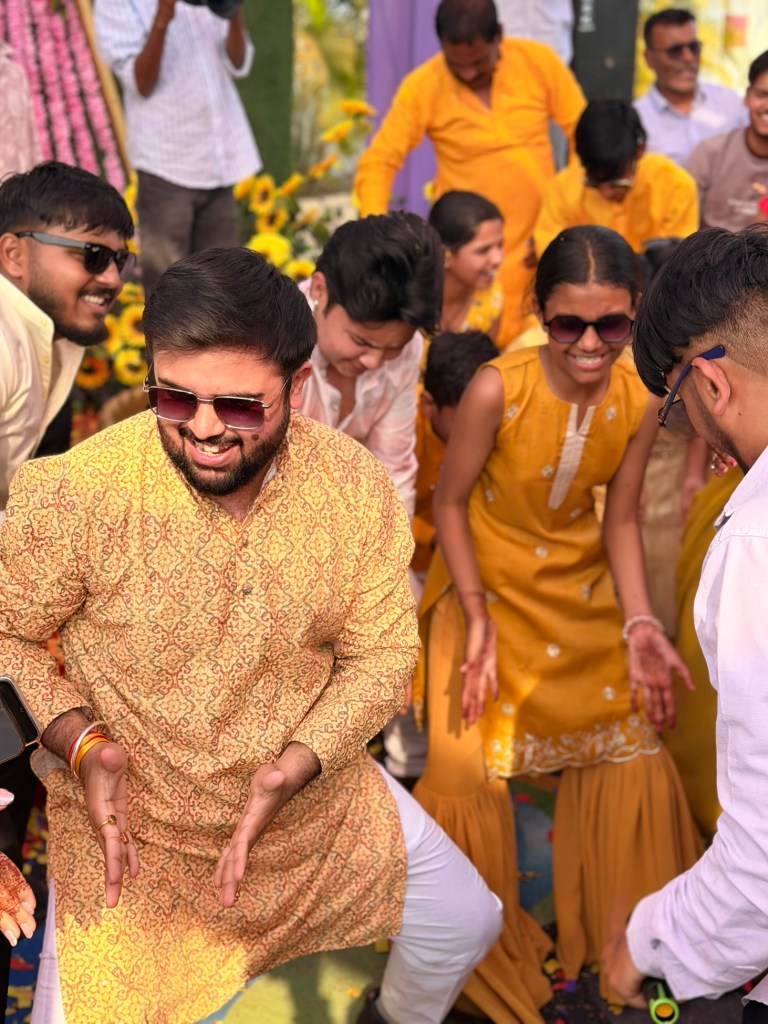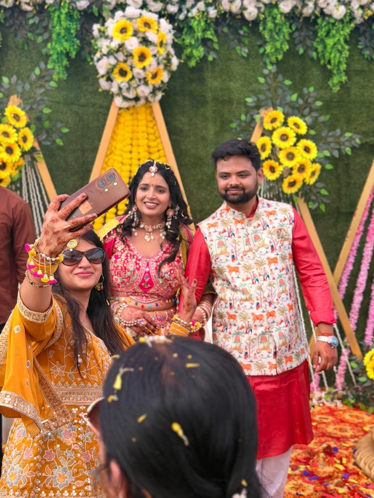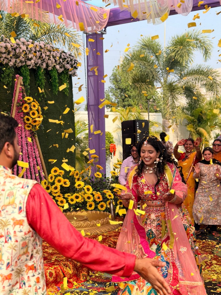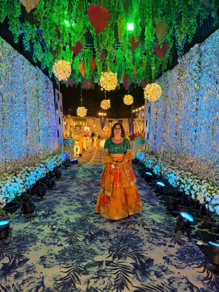The Haldi ceremony felt like stepping into another world — one entirely dipped in yellow. Everywhere I looked, there were shades of marigold, saffron, lemon. Monika had gifted us two beautiful outfits for the ceremonies, one of which was a yellow outfit specifically for this event.