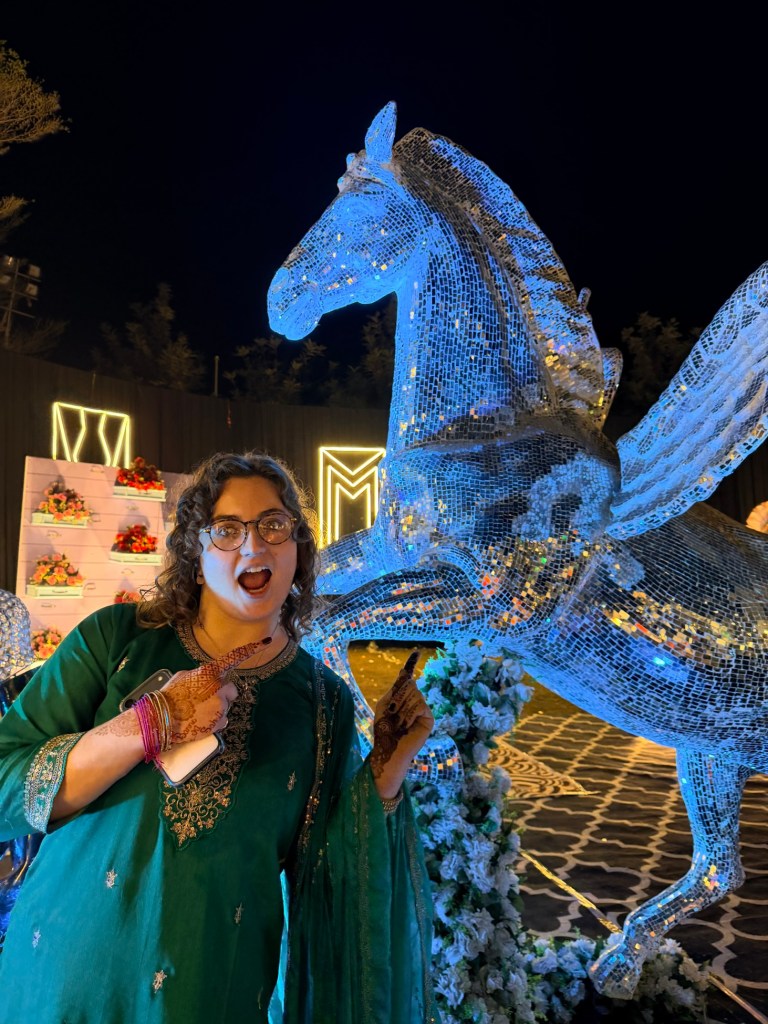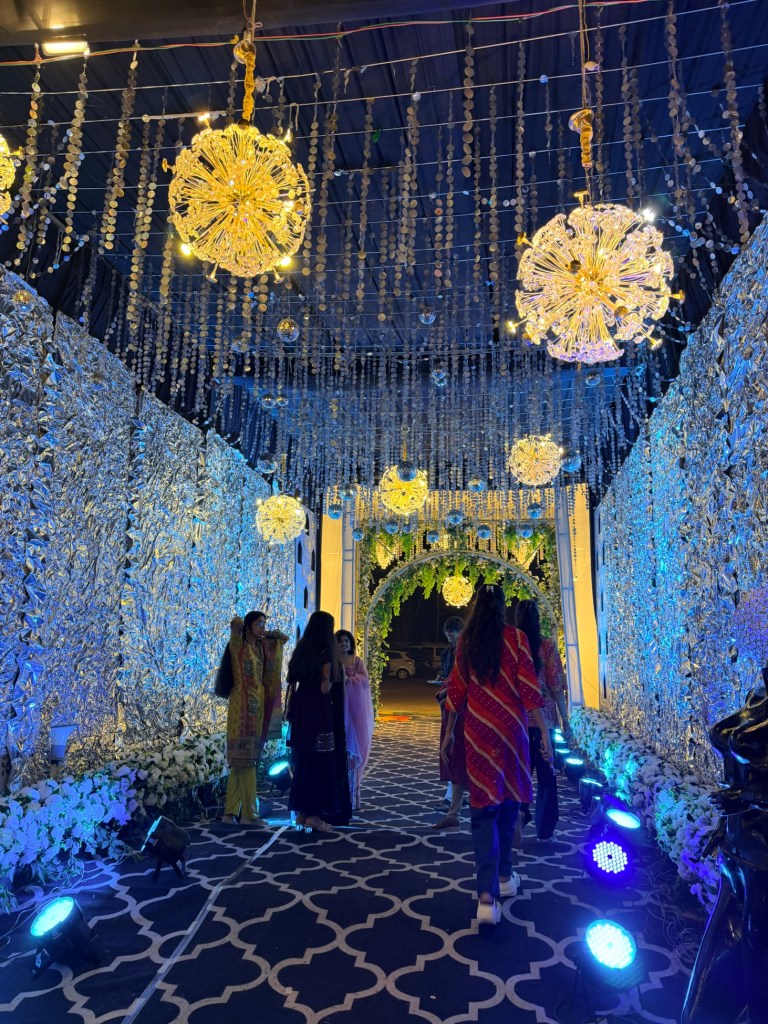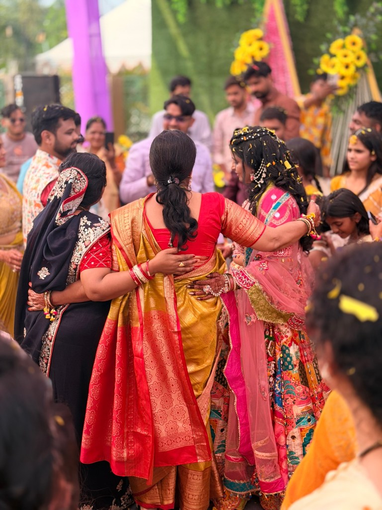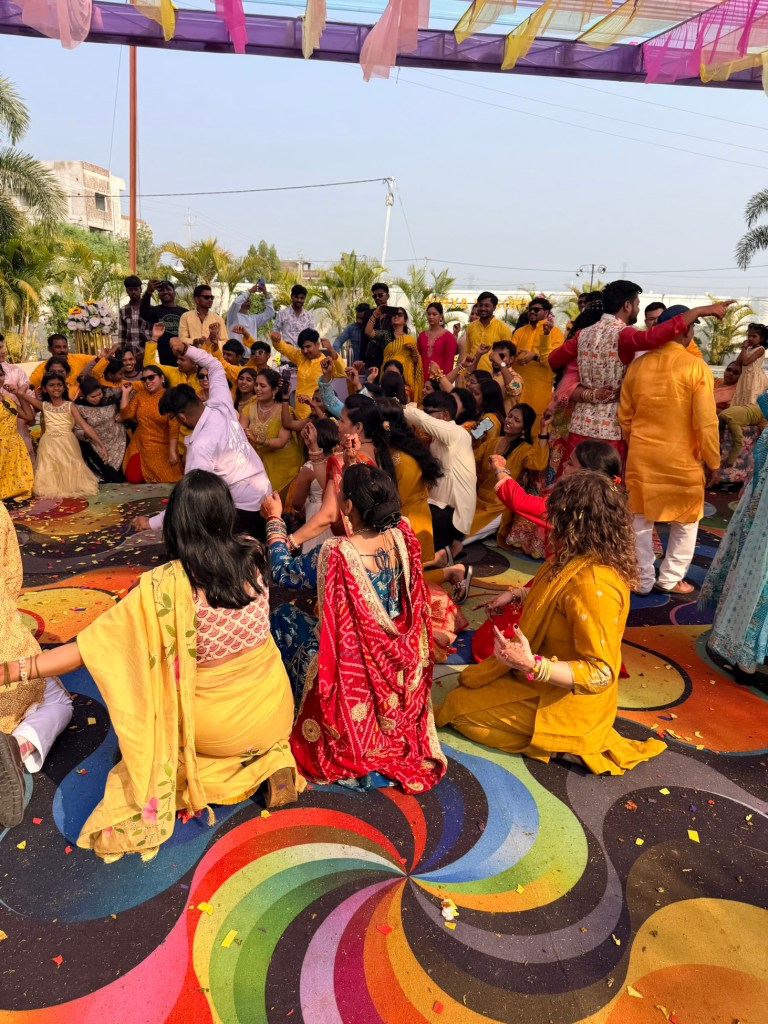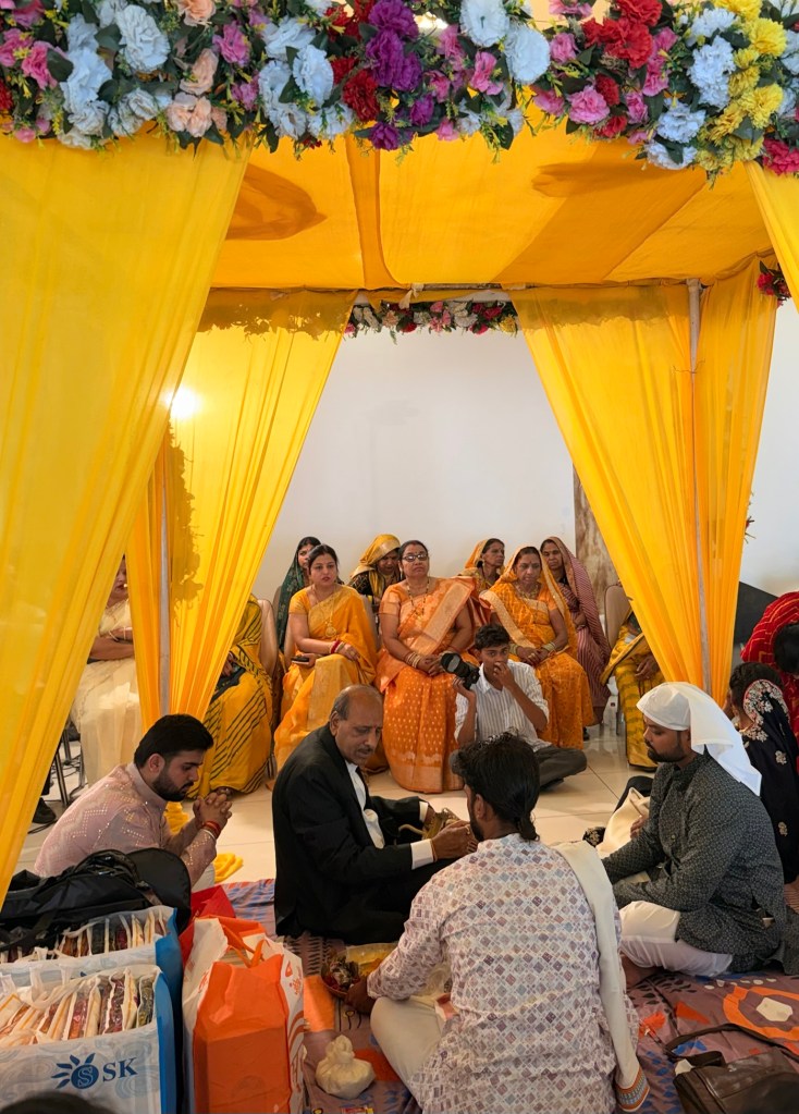The Haldi ceremony felt like stepping into another world — one entirely dipped in yellow. Everywhere I looked, there were shades of marigold, saffron, lemon. Monika had gifted us two beautiful outfits for the ceremonies, one of which was a yellow outfit specifically for this event.